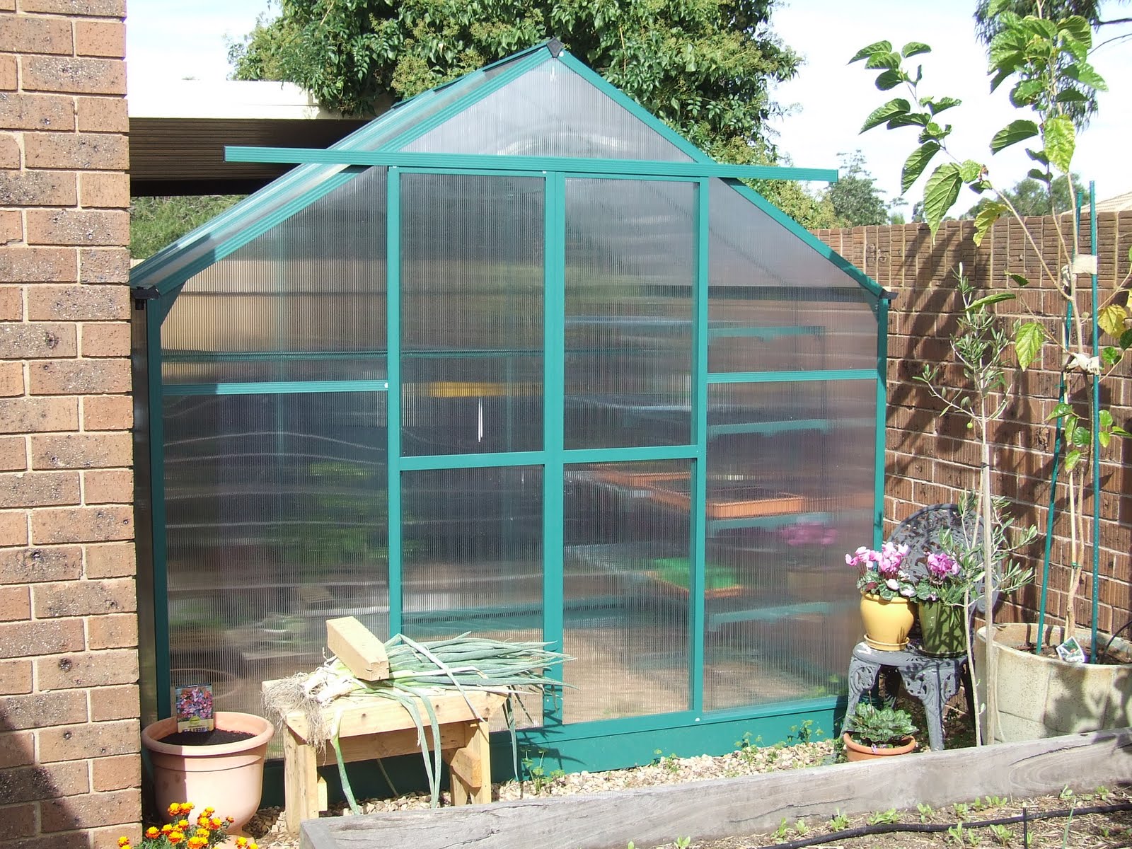 The greenhouse still stands and is filling up. Notice the massive spring onions on the stool. I used them in some yummy cream of celery soup that I whipped up for dinner.