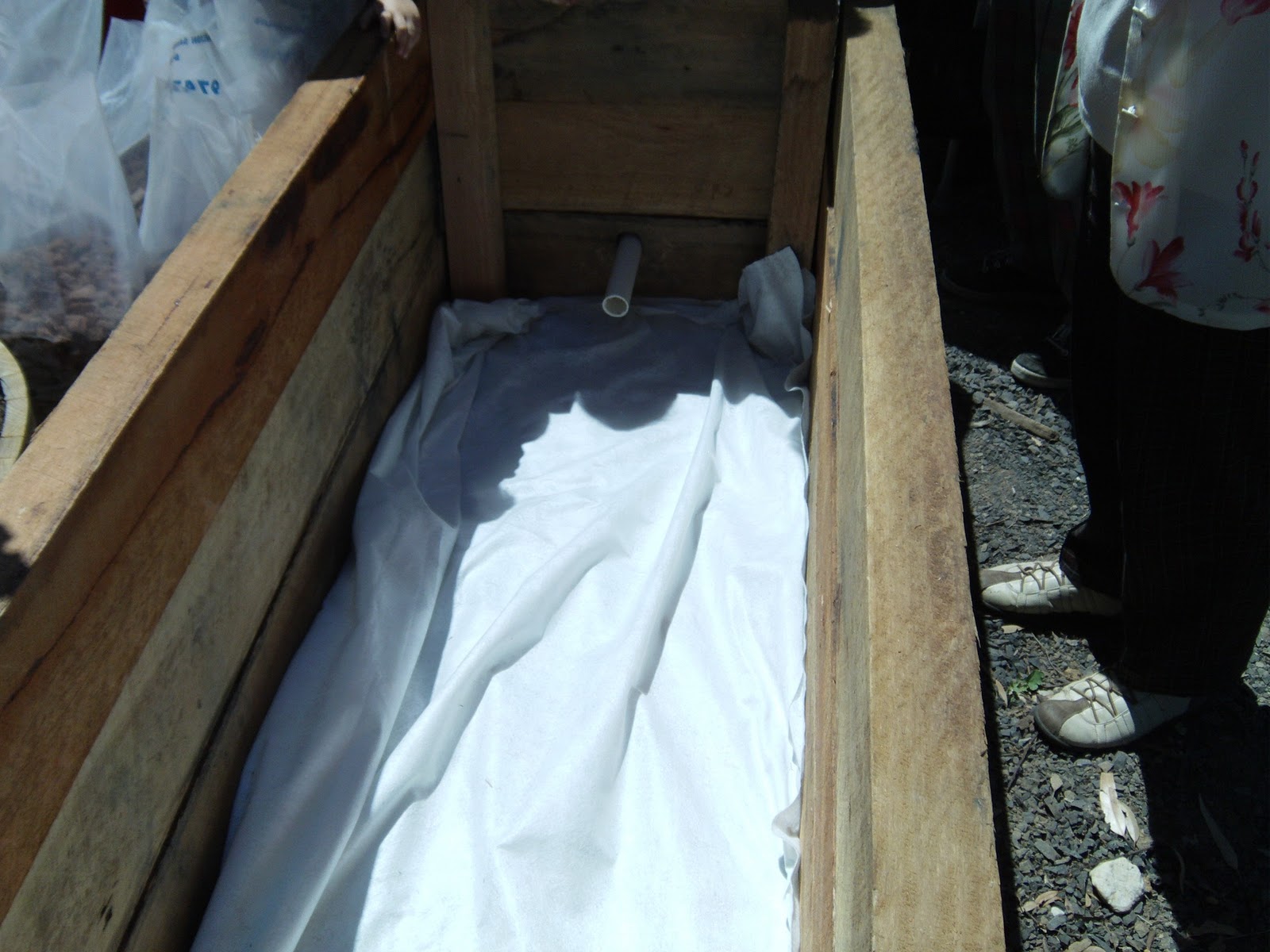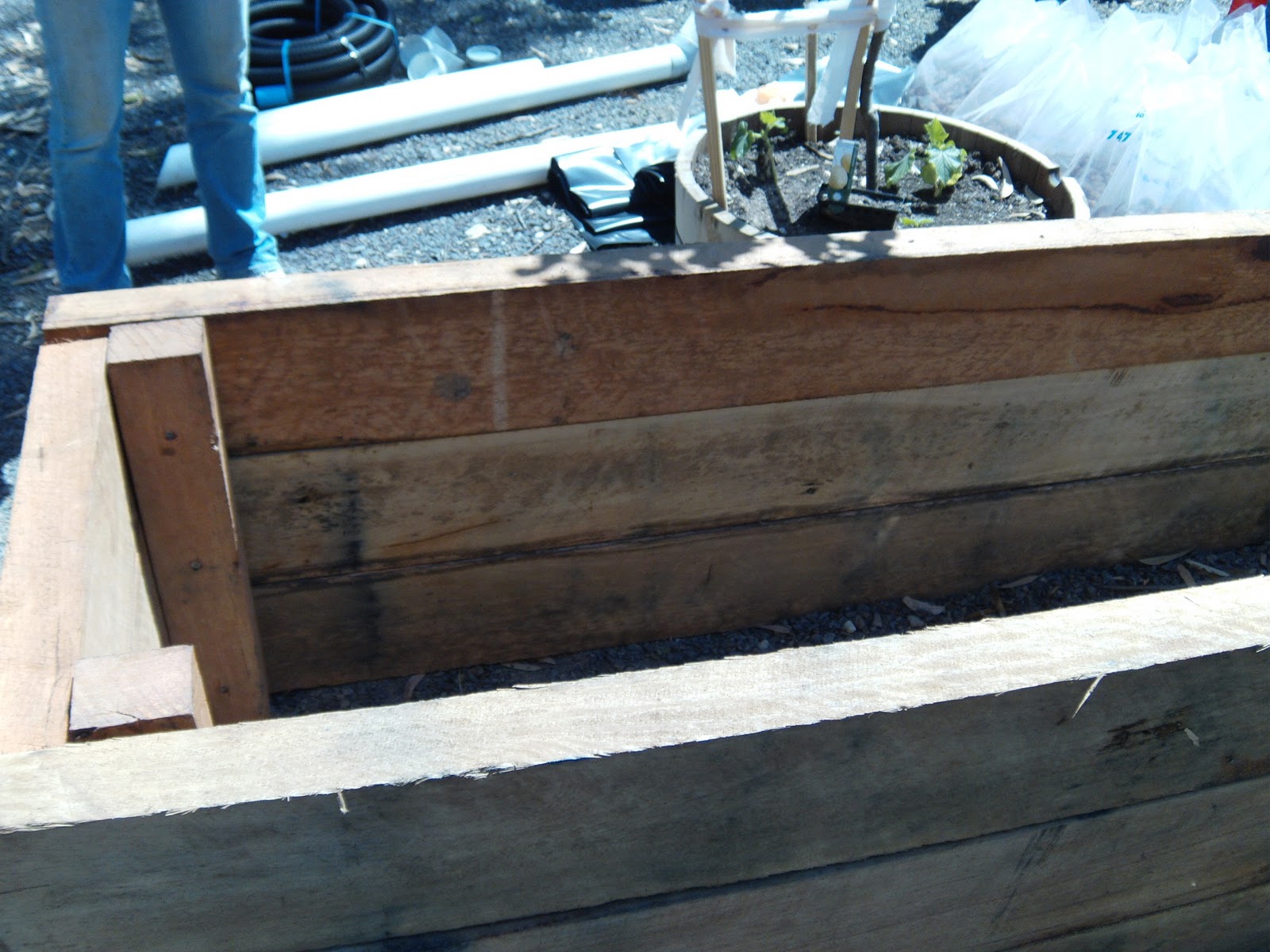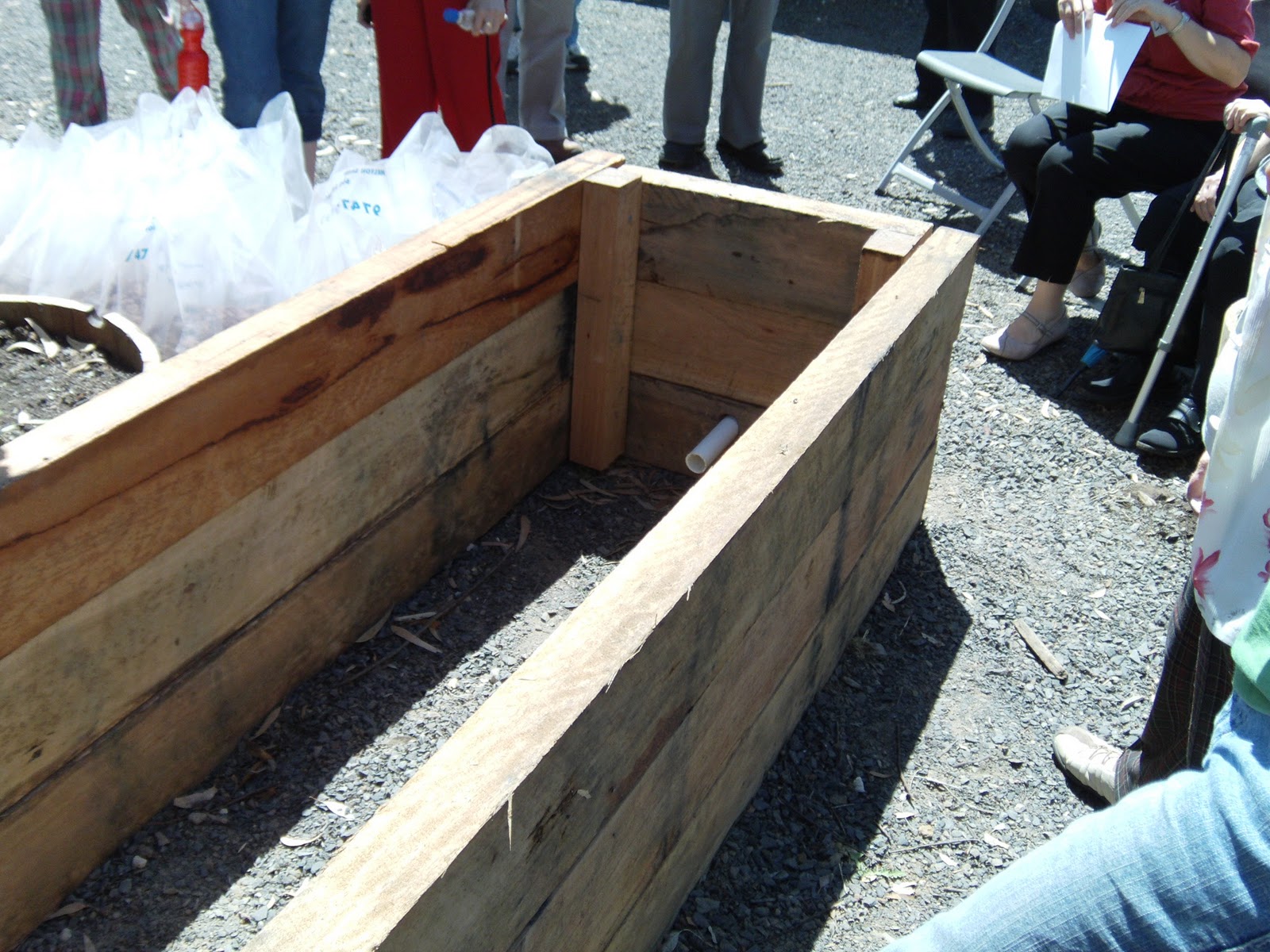This was one big bed. I was kind of shocked to see how tall it was compared to the wicking bed that I had made. My bed only came up to the bottom sleeper, and for this bed, that was the size of the reservoir. It was 60cm wide, 150cm high and 240cm long. It was already made prior to the demonstration by the fellows at the Men’s Shed, which was nice of them.