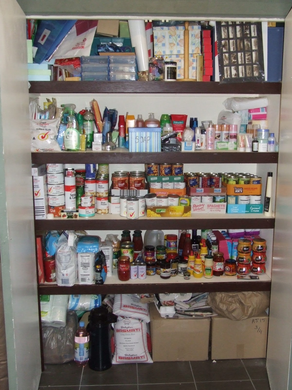 This is our main stockpile cupboard. Shelf two has cleaning and personal hygiene products. Shelf 3 has cereals, tinned food like tuna, potatoes, beans, corn, baked beans, spaghetti, coconut milk, chickpeas and a few other. Shelf four has flour, sugar, sauces, pastes, UHT milk. The floor has rices, toilet rolls, and non-stockpile items. Have a closer look below.