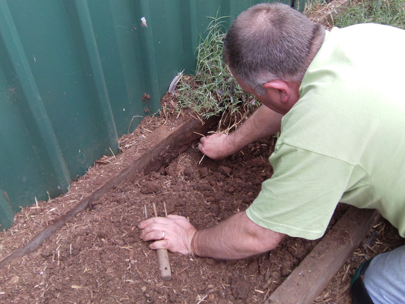 Garlic is so easy to plant. Just dig a hole double the length of the clove (about 5cm) and bung it in, pointy end up.