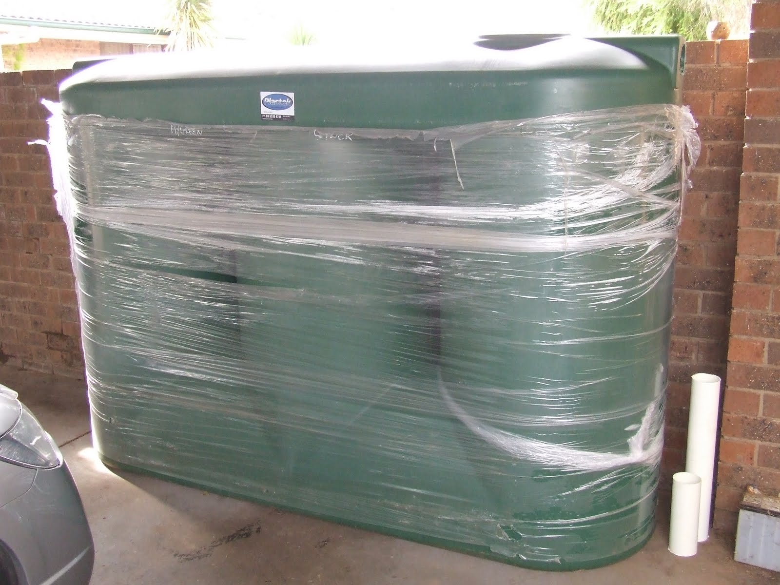 After saving up my pennies, I finally purchased a second rainwater tank, which arrived on Friday. It is a slimline 2100 litre tank that will be fitted in the carport area. My friend and neighbour Rick, will be helping me attach some guttering to the carport over the next few weekends, and I will plumb up the tank and connect some irrigation work to it. Nothing like water security to put a smile on your face, but why it is wrapped in a mountain of plastic is any ones guess. What a waste!