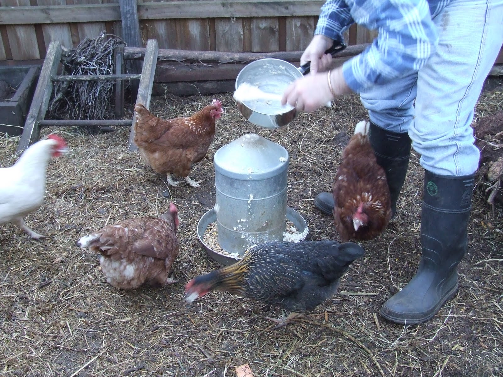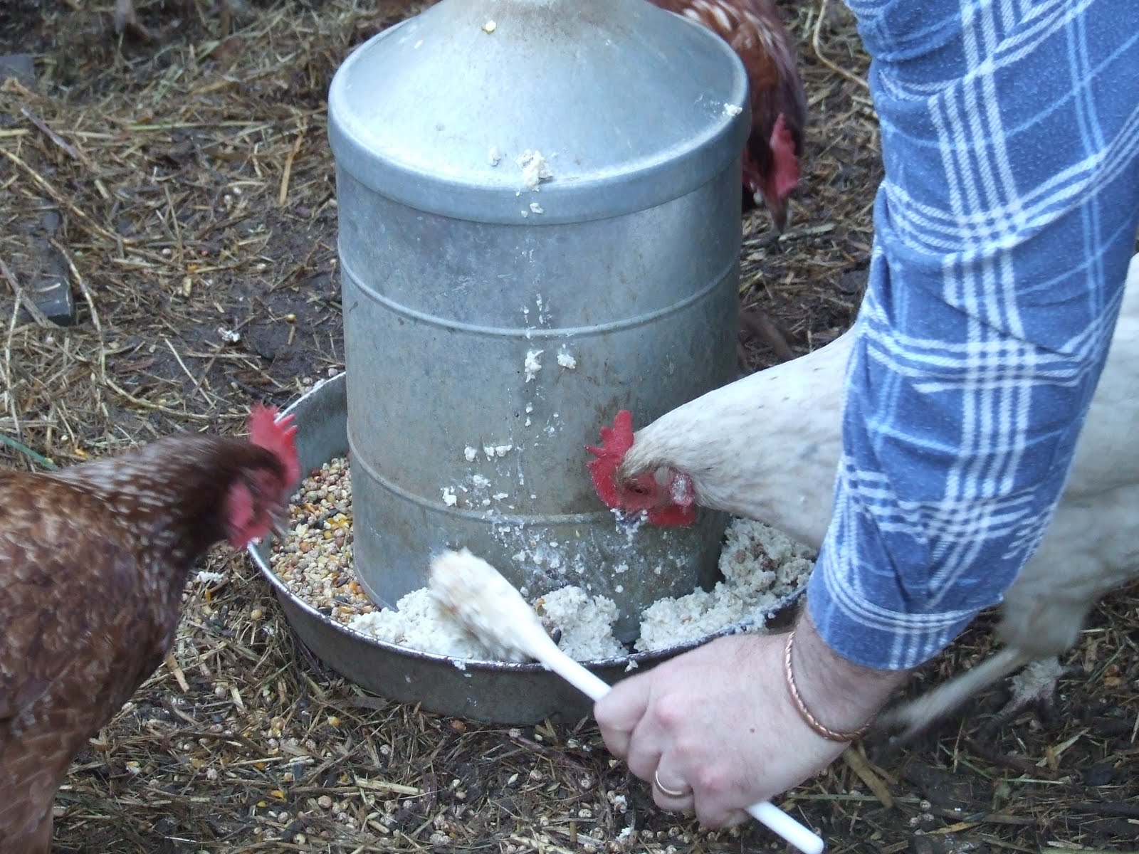 The chickens get it straight up and thick which they love. Here is some pictures of me feeding them some warm porridge this morning. They just go crazy for it.