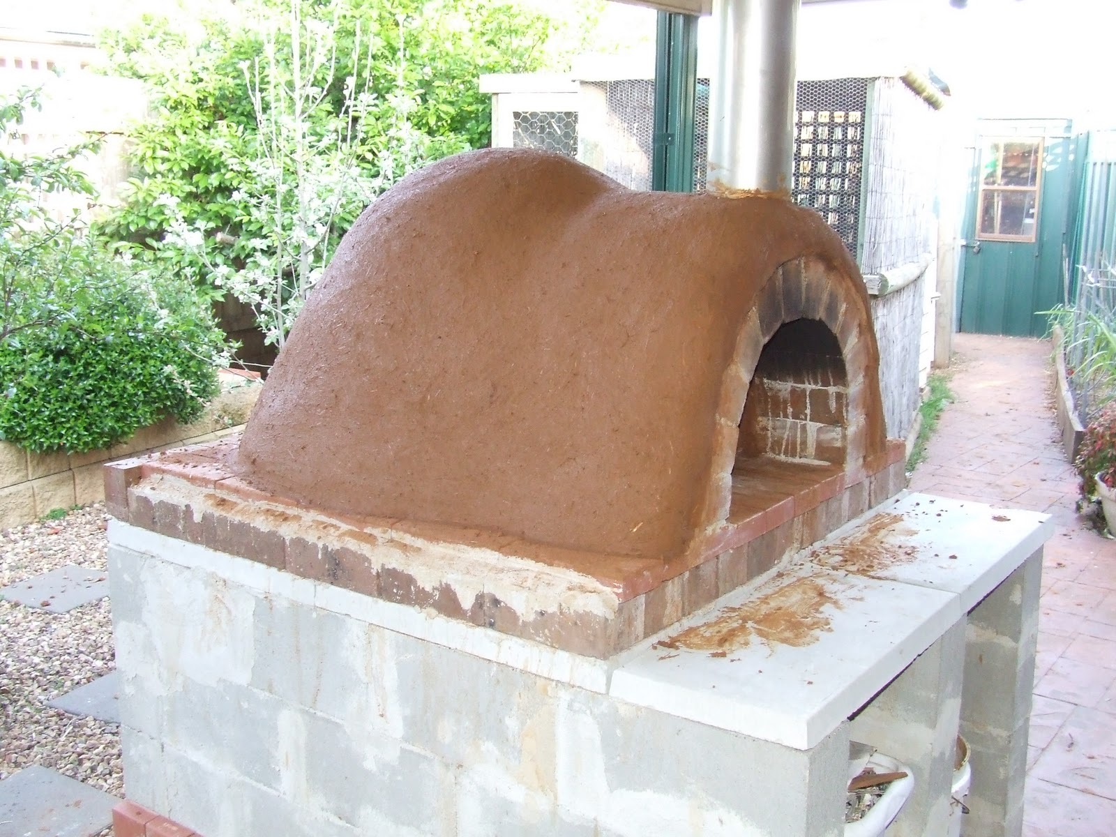 Here is the finish (click to enlarge). As you can see, it is very sandy, but because I still used clay and straw, it has gone rock hard today. I will give the oven a light firing on Wednesday night to speed up the drying, as Kim wants to apply the mosaics this weekend. To do that, I will add a light coat of render made up of sand and cement with a oxide mixed through it. It will only be about 1 cm in thickness, but should hold the mosaic tiles firmly in place. At the same time, I will render the besser bricks, and fix up the mantle which I have the materials for.