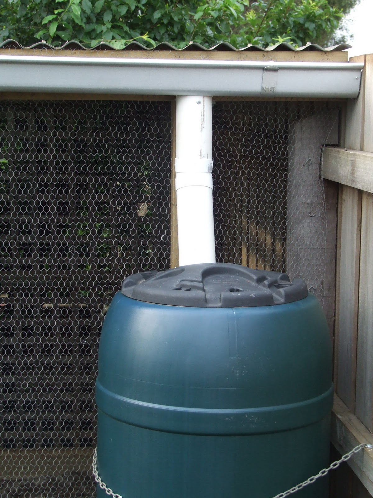 To combat any disaster, we secured it with some galvanised change that I had laying around. It should stay in place even when full. We connected the down pipe using a 22.5 degree elbow joint with the pipe extending about 4cm into the barrel.