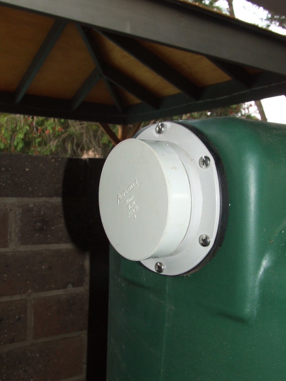 The top of the tank has a mesh filter to prevent any mosquitoes and leaves that sneak past the diverter from falling into the tank. Note that we fitted a mesh screen and proper outlet so that the overflow can be fitted tomorrow. The hole that had been pre-cut by the tank manufacturer was too small, so I spent a good 30 minutes filing the hole bigger so that the outlet would fit properly. We then glued in the mosquito mesh to stop the beasties from breeding in the water.