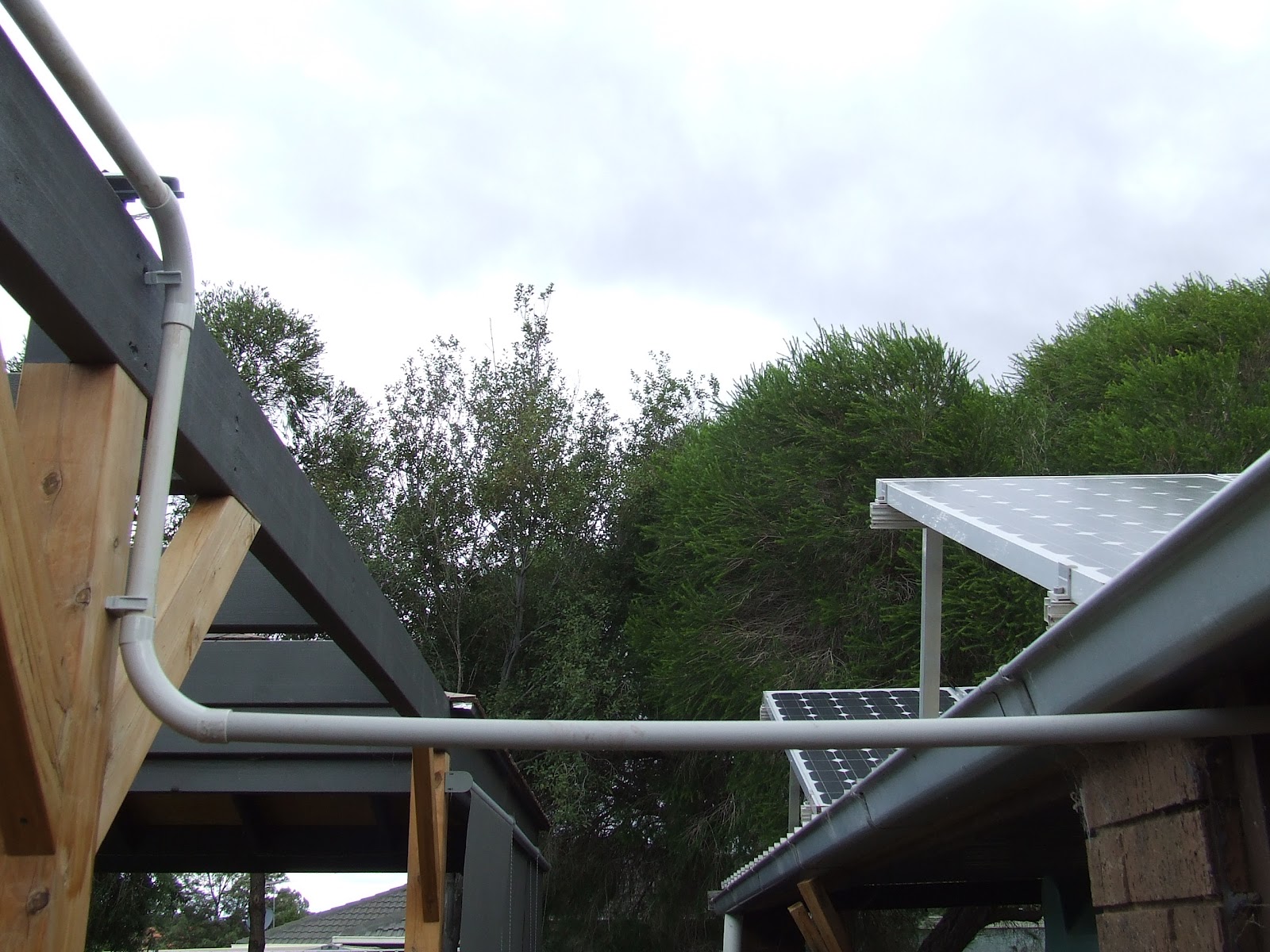 And finally down the post a bit and across to the carport where the battery box is located. Total cost of a neat wiring run = $20 for elbow joints and clips. Just as fate would have it, the cable was about a metre too short so I have to wait until Tuesday until I can source some thick gauge wire (10mm2) to connect the panels to the charge controller.