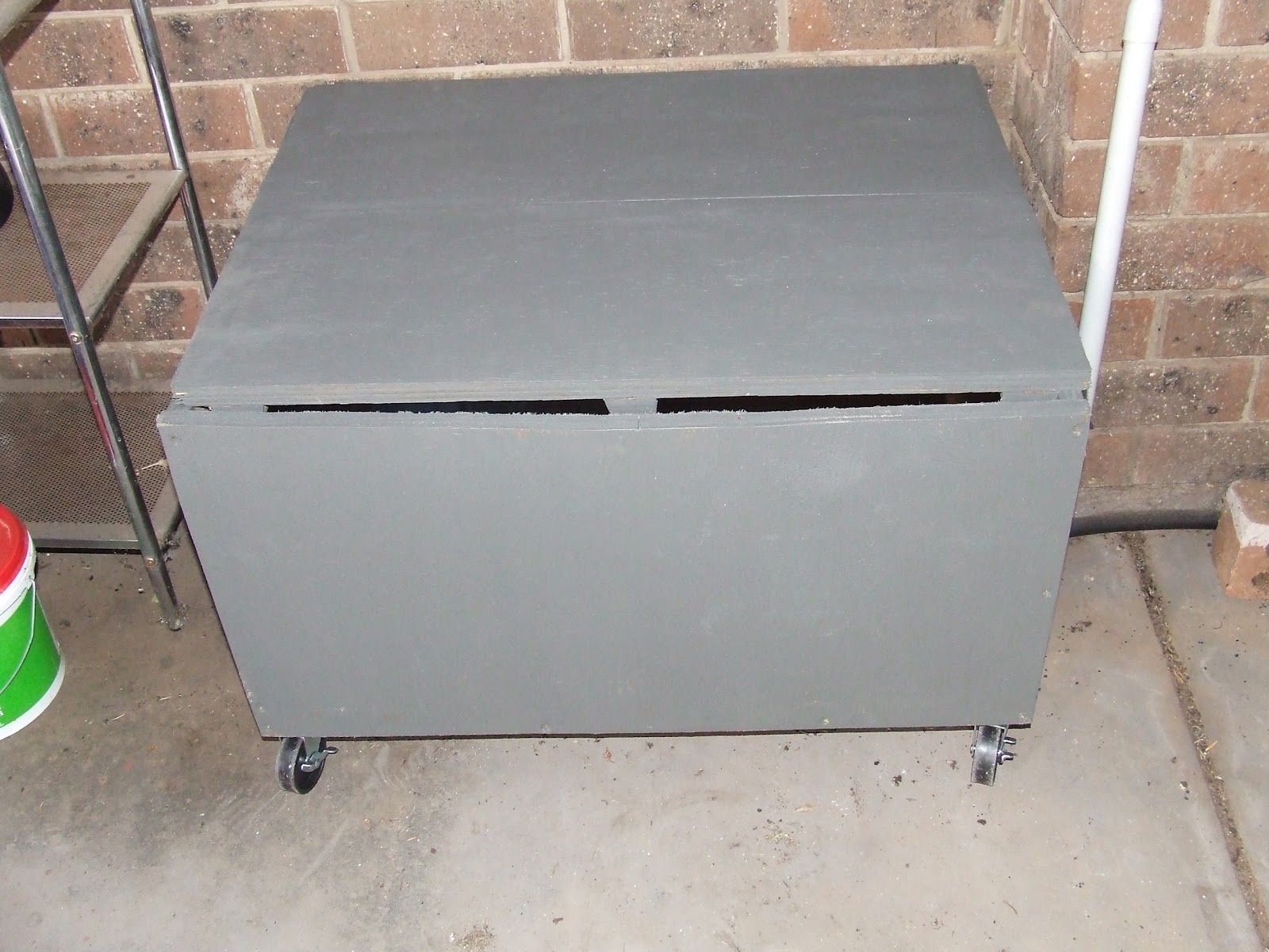 Ben helped me fit the lid with the hinges, and here is the finished product ready to be wheeled into place.