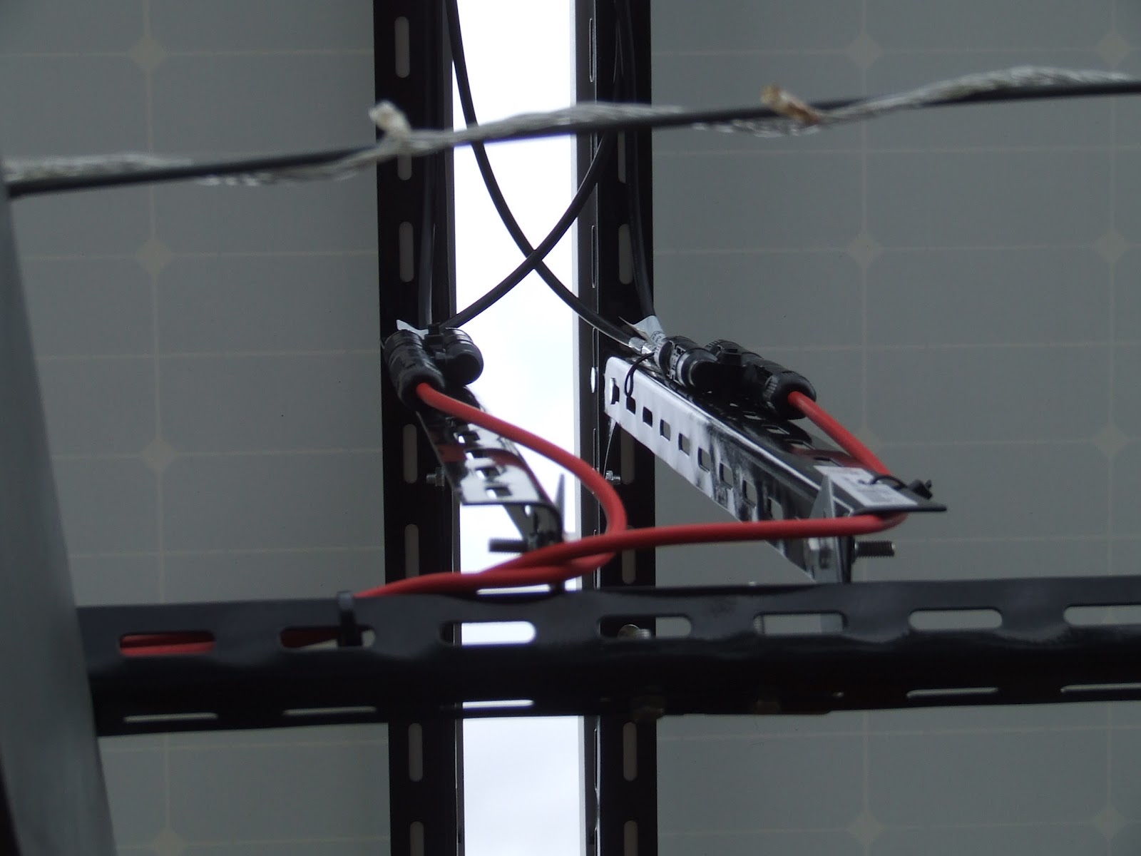 Then it was back up the ladder to finish the wiring. The 12 metre length of wire was cut in half with the negative end taped with duct tape off so not to accidentally short circuit the panels if the two exposed ends touched. The two connectors were cable tied into place and I ran the wire along the supports that I installed yesterday.