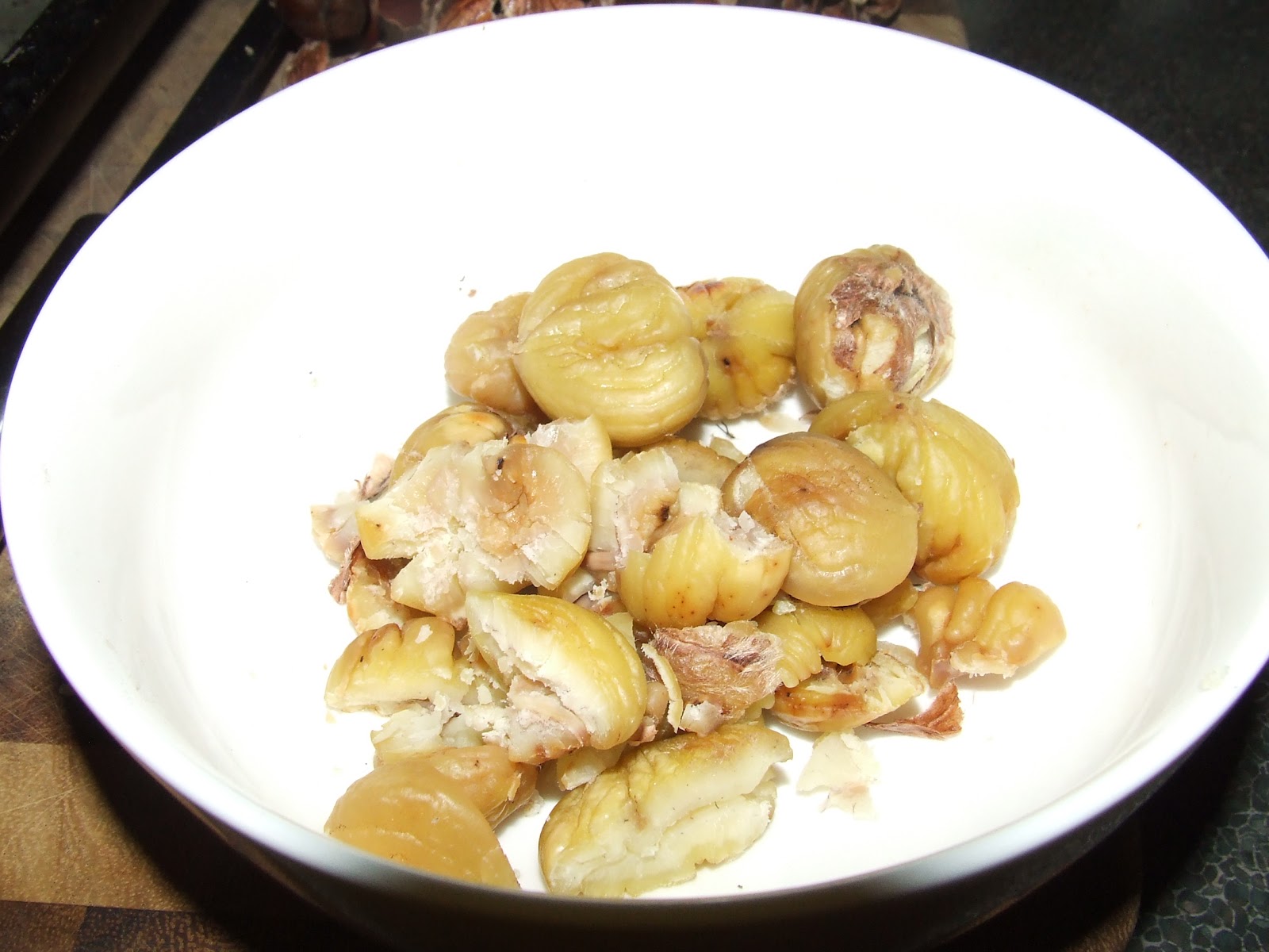 Remove the cover and start peeling. Any chestnuts that are black on the inside discard as they are rotten and taste foul (I know, I ate one thinking that it was just over cooked).