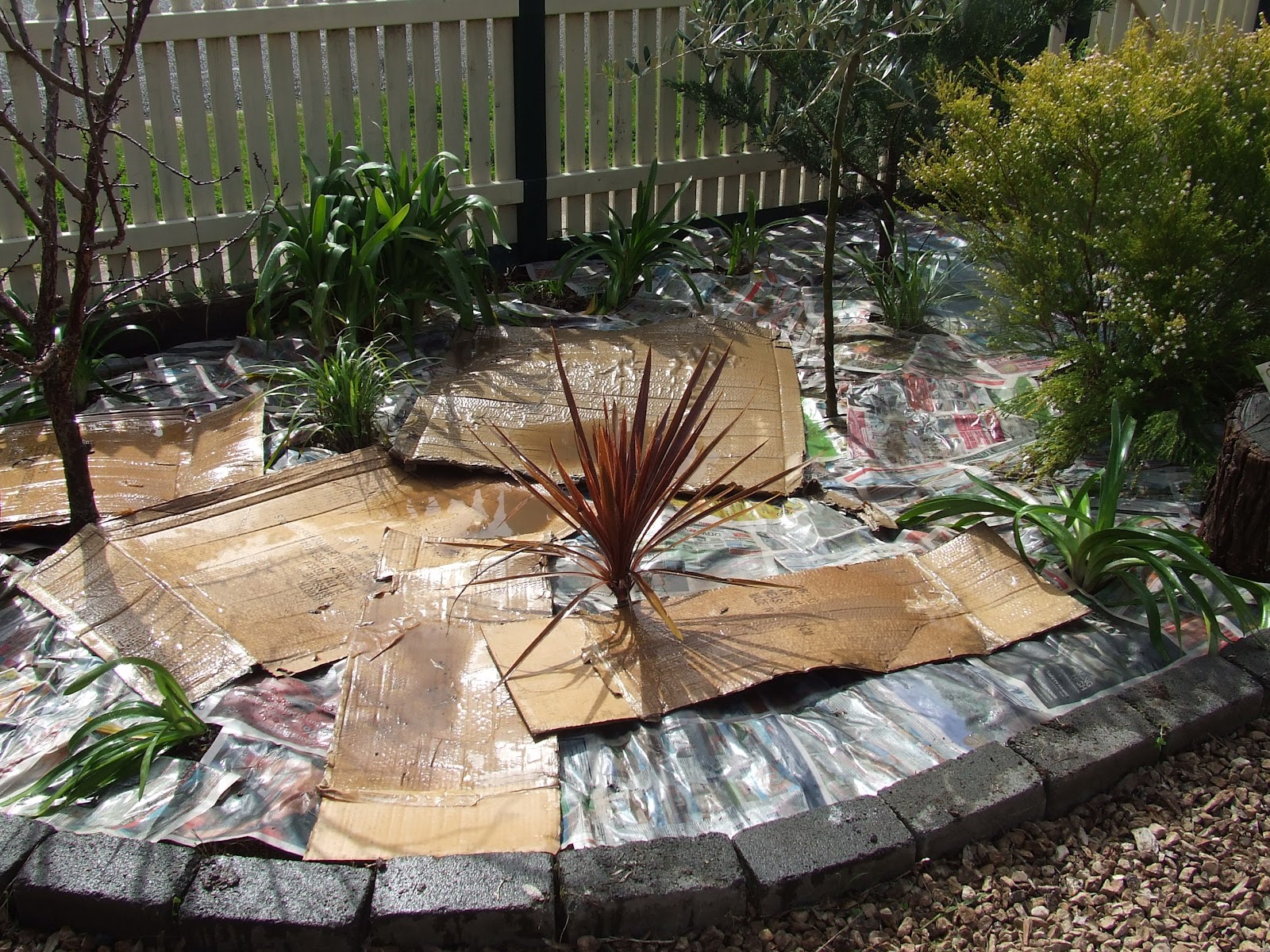 As you can see, this is a bit like a patchwork quilt in the making. Ripping bits of cardboard to fit all those fiddly places around trees and shrubs.