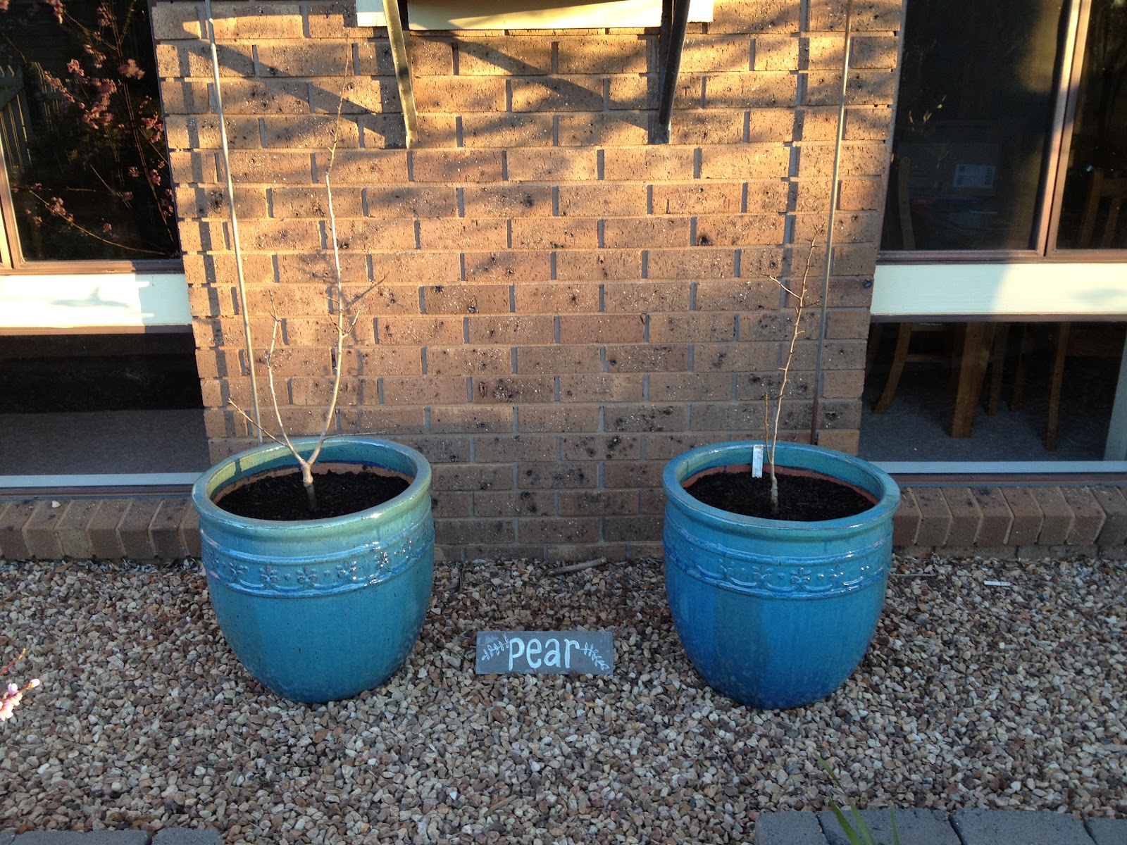 This morning, Kim and I potted up the two cocktail pear trees that we dug out of the ground.