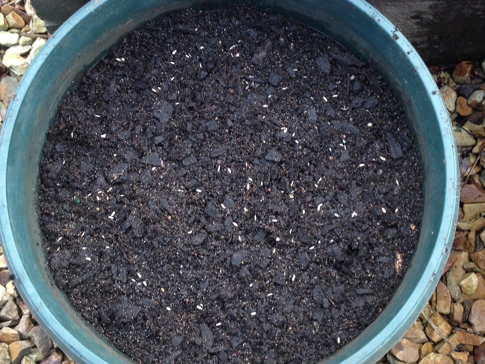 We ran out of pots, so I had a look in the greenhouse and found some potting mix in tubes. Ben tipped them all into this large pot and rehydrated the potting mix. He added blood and bone and mixed it all in. He then planted the radish seeds into it.
