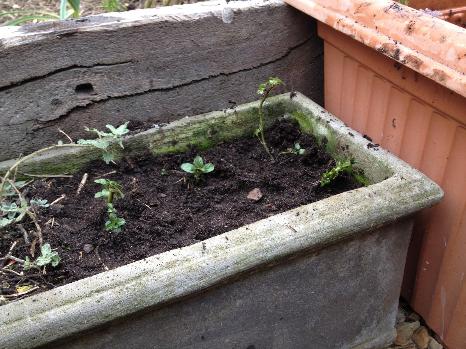 Firstly, I showed Ben how to propagate Peppermint. We dug out a little of the root from another pot with peppermint just starting to regrow, and he transplanted it into this grey pot. Like all mints, it will flourish in no time.