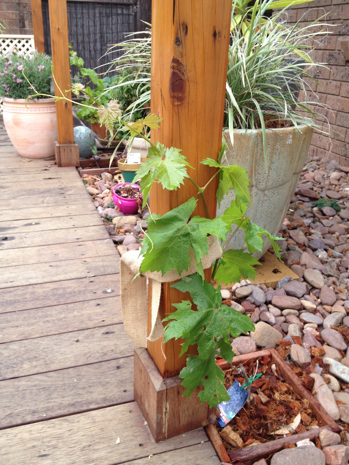 The new grape vines are growing strongly, and they needed to be trained up the posts of the arbour I have been utilising thick jute ribbon for this purpose as it allows the vine to expand as it grows. I also pruned off any side shoots to maximise upward growth. I am hoping that they reach the top of the arbour by the end of the growing season in April. I fertilised each vine with nutrient tea to promote healthy growth.