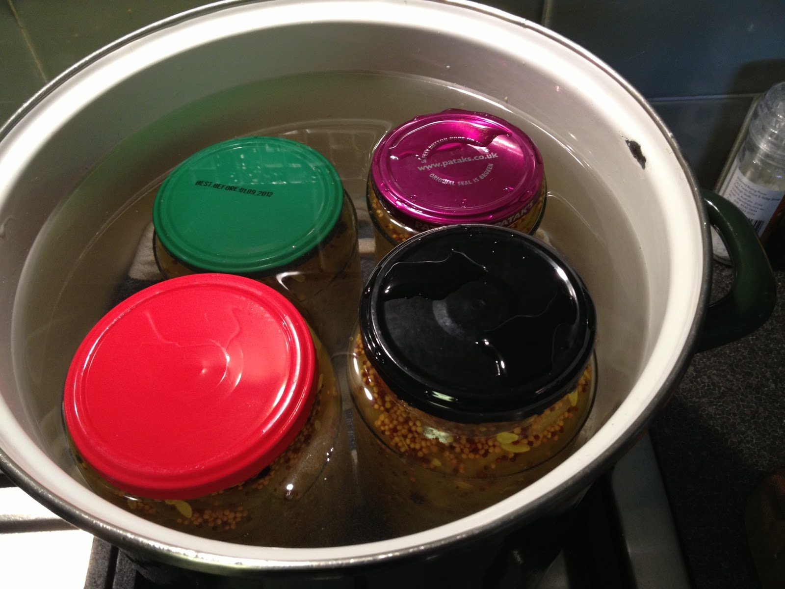 Place in a large pot with a clean tea towel on the bottom, and fill with water just up to the lids. Bring up to the boil and process for 10 minutes in the hot water bath.