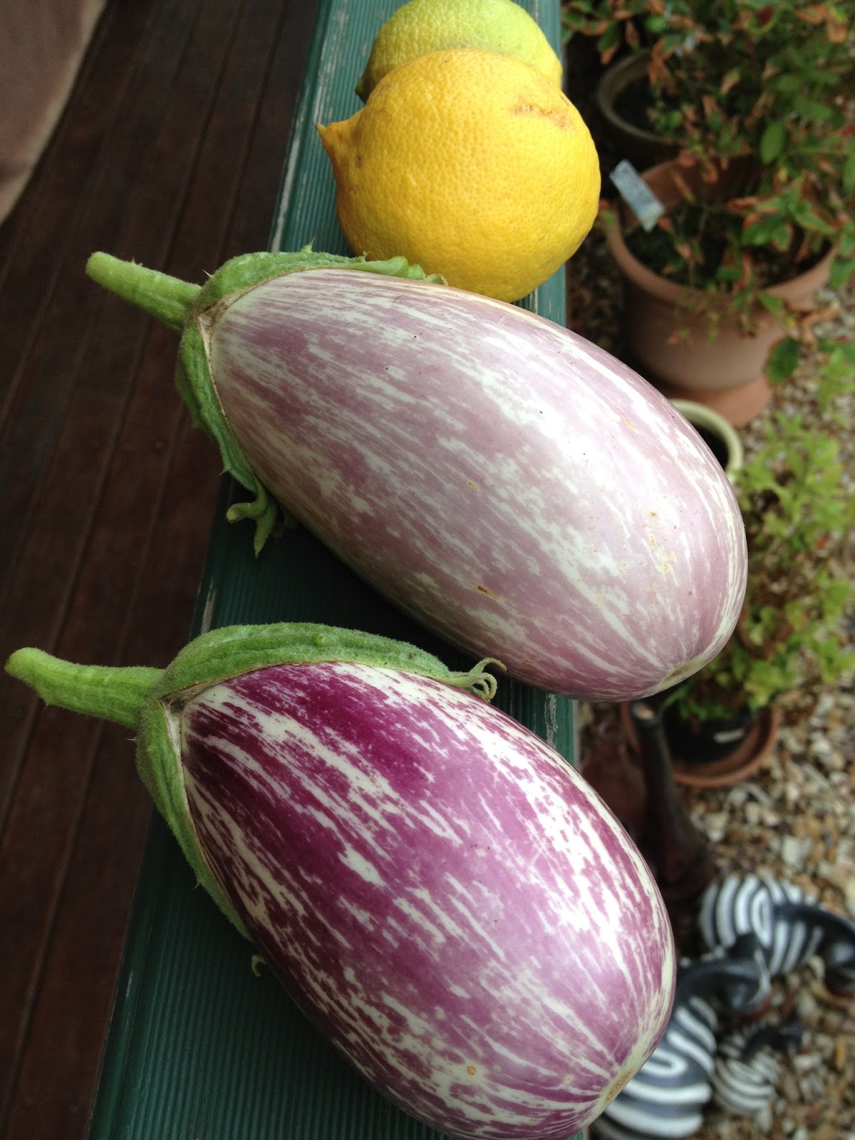 I also harvested these beautiful eggplants (aubergines). The cultivar is called Listada di Gandia, and I have been saving the seeds for five years now. It is just a nice as the normal long purple cultivars, but far less susceptible to getting burnt in the extreme heat of summer.