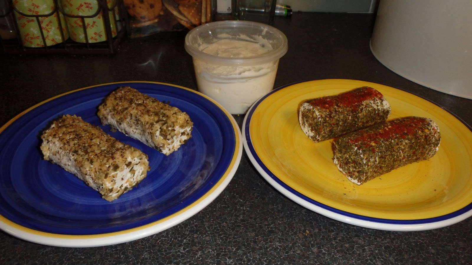 The left hand logs are rolled in re-hydrated chives and onions with a sprinkle of cracked black pepper, and the right hand logs are rolled in Italian herb mix with a sprinkle of sweet paprika. Kim and I had a little of each last night with plain water crackers and the taste was divine. Kim said I could sell them, no problems at all.