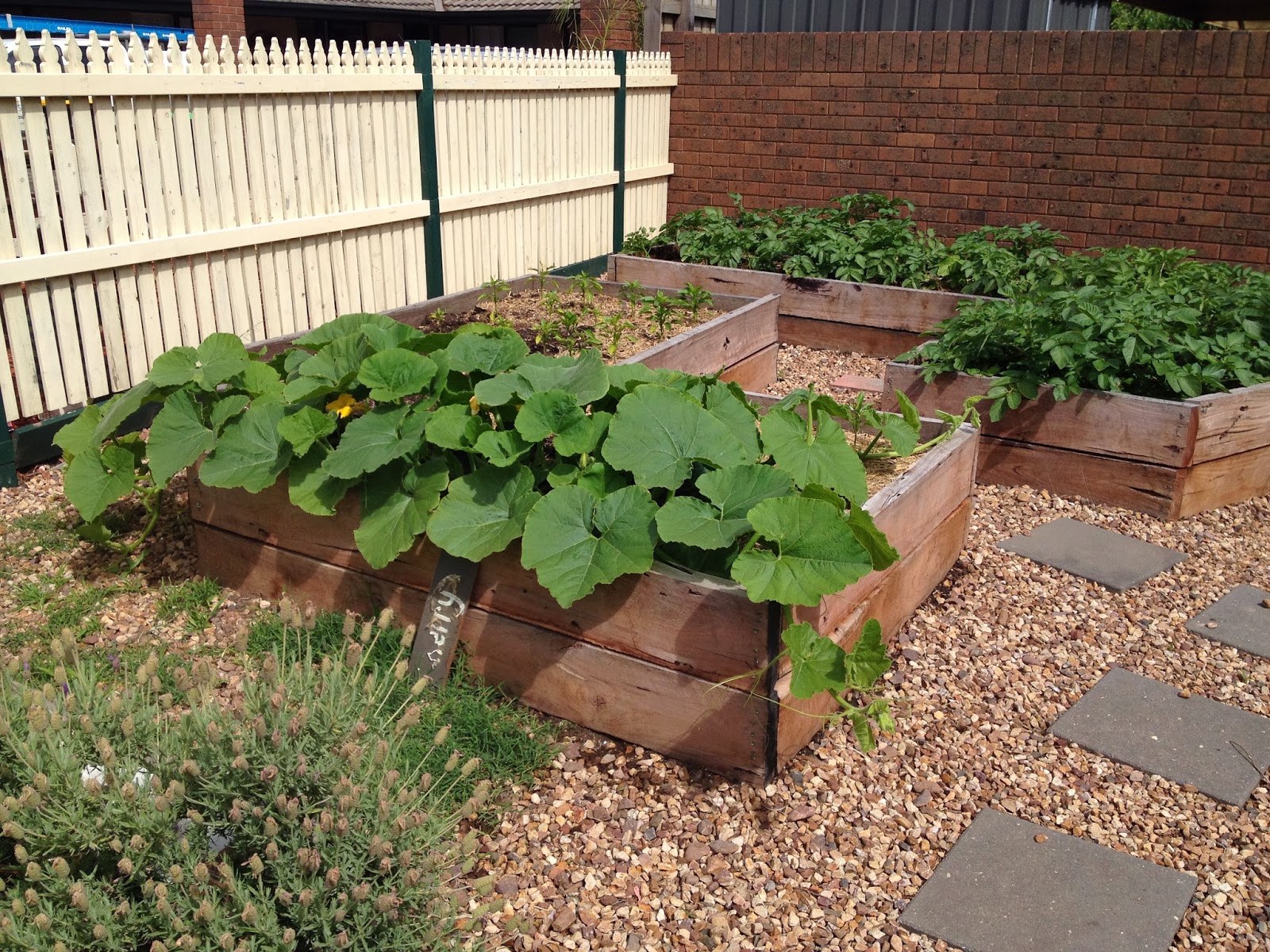 Now to the front yard veggie patch. You can see the two beds that I made at the start of spring. The Queensland blue pumpkins took off, and are sending their tendrils all over the place. They are about to spill onto the ground and start weaving their way around the garden. The butternut seedlings that I put in all but died, but I have hope for the two remaining plants which are showing signs of recovery. I think that the colder nights this spring have really affected them.
