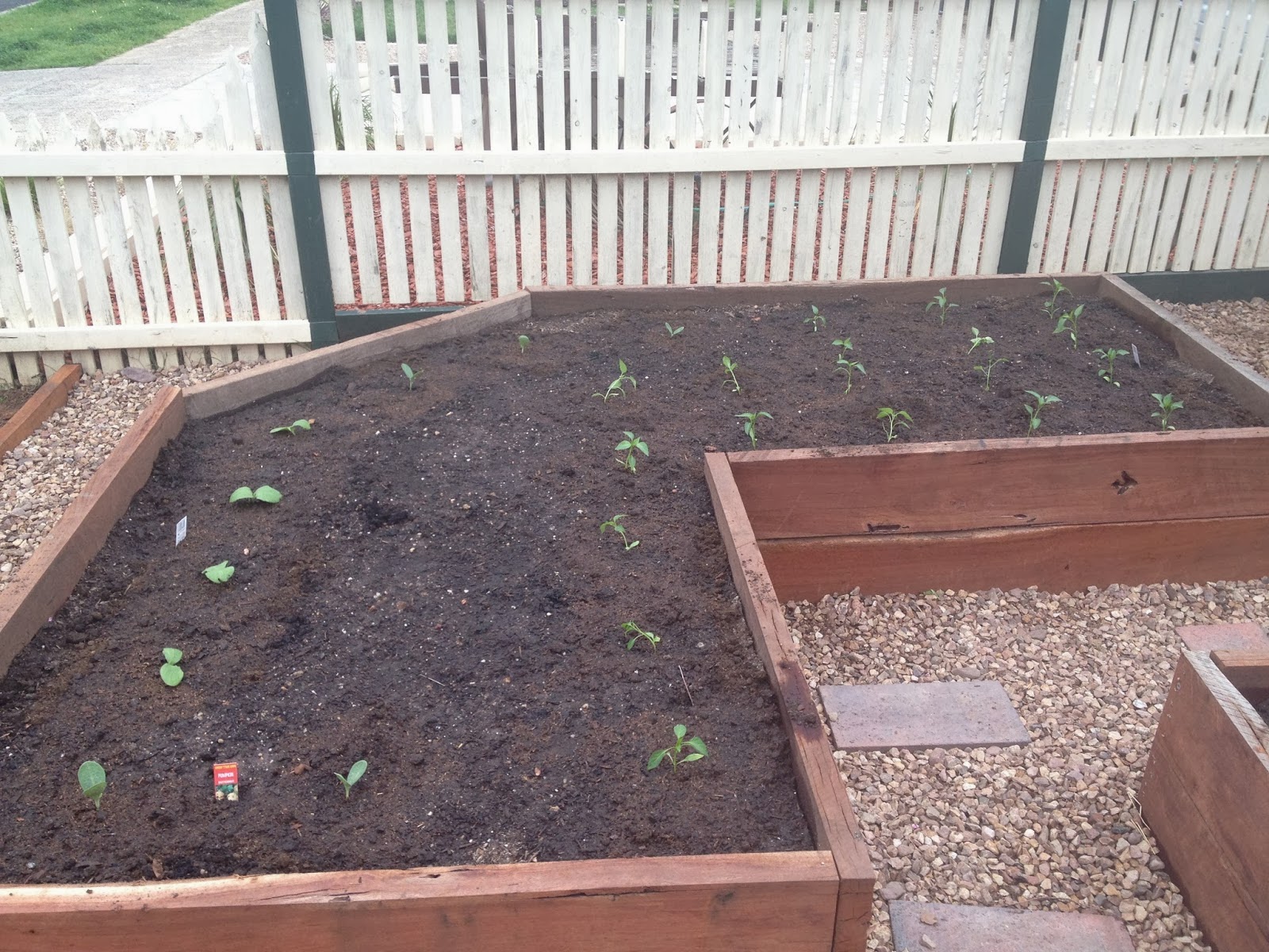 The wonderful rain has been most helpful with the garden growing but sadly the accompanying temperatures in those 350 metres further above sea level than Melton means it’s been too cold for much action in the pumpkin patch. I so have plenty of seeds up – around 60 at last count out the front and a further 20 out the back (all different varieties and more to go in yet) but most of them are at the cotyledon stage alone, or just discovering their first true leaves. Last year they were up and growing a lot sooner and the weather I think was a little more friendly as far as temperatures went but even so our pumpkins were small and a little lacking in flavour. Last year was warm and dry, this year cold and wet. I can only hope that the temperatures next week hang around to stay (26 here) so I can have some hope of a harvest. Still, a little worm wee might encourage them somewhat. 🙂